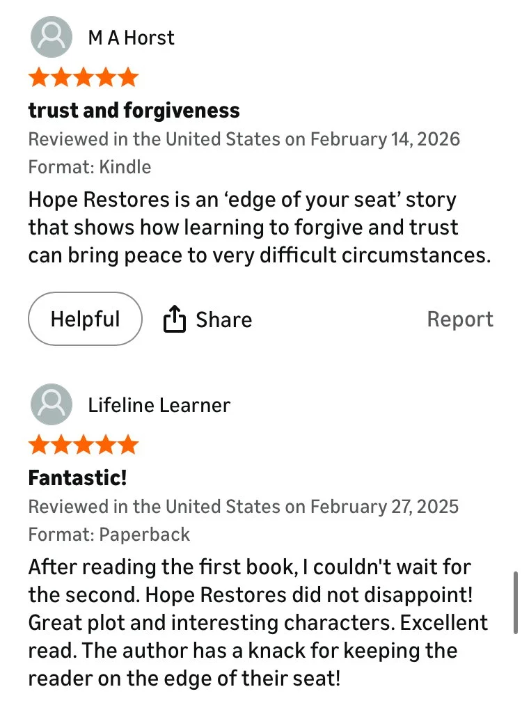 Normal was never a word Emma Grant used to describe her life — a life that had been full of secrets and struggles. In the midst of navigating her growing relationship with the government agent, Christopher Clark, Emma struggles to forgive her fugitive mother and those who have hurt her throughout her life. Through twists and turns and people who were once good turning bad, Emma begins losing faith and must find strength as hope restores.